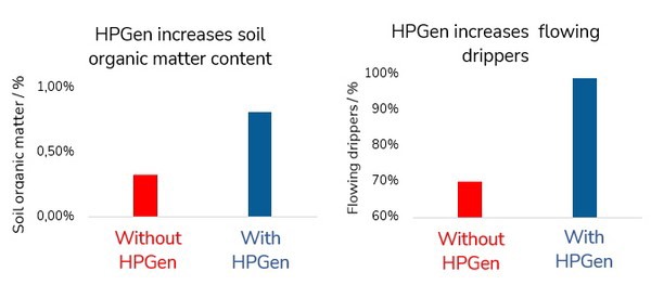 De druppelaars in de behandelde sector werden beoordeeld door teeltmedewerker Jose María, die concludeert: “Behandeling met HPGen resulteerde overal in schone druppelaars.” Naast uniforme irrigatie nam de hoeveelheid organische stof spectaculair toe, van 0,33% tot meer dan 0,8%.