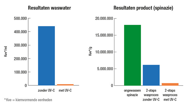 Het microbiologisch schoner waswater heeft ook een duidelijk positief effect op het gewassen eindproduct. Een reductie van circa 1,5 log (circa 96%) is gemeten bij een 2-staps wasproces met alleen in de tweede wasser UV-C. Dit wordt in de grafiek hieronder weergegeven. Zonder de toepassing van UV-C is de reductie niet meer dan ongeveer 65%.