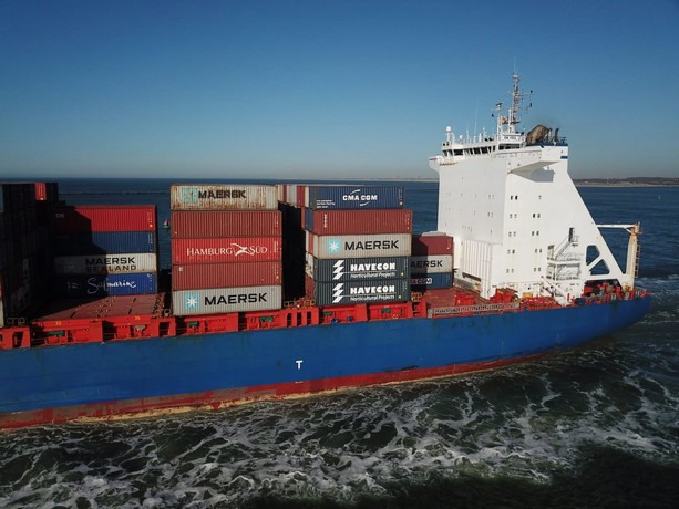 Nee, er ligt niet weer een schip vast in een kanaal. In tegenstelling - deze vaart lekker door. En dat moet ook: zoals u kunt zien staan er containers op van Havecon Horticultural Projects en die hebben ze in de VS en Canada hard nodig.
