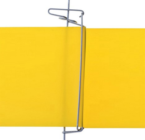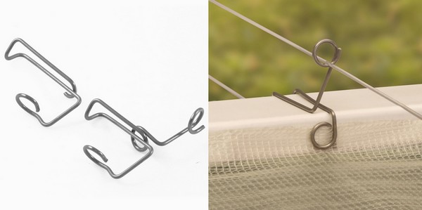Links de eerste T3 spantklem uit draad zoals door Blok’s Draadvorm geïntroduceerd in 2002 voor toepassing op schermingsinstallaties. Rechts de Philippo spantklem uit draad met extra opwaaioog voor het schermdoek. Deze spantklem is vernoemd naar bedenker en mede-eigenaar Philip Blok.
