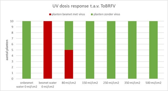 Bij elke UV dosis zijn 10 tomatenplantjes met het behandelde drainwater geïnoculeerd en zijn de plantjes na twee weken via een ELISA test onderzocht op de aanwezigheid van ToBRFV. Bij een dosis van 150 mJ/cm2 en hoger is in de plantjes geen ToBRFV aangetroffen.