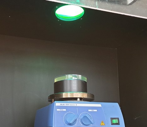 De proefopstelling, met in het midden een schaaltje met besmet drainwater en daarboven een lichtbron met UV-licht