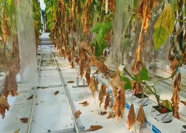 Beeld uit de proef met Prestop in komkommer. Hier het onbehandelde deel, zoals telers het in hun kas dus niet willen zien.