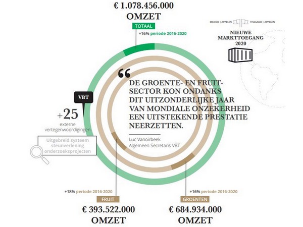 De omzet van groenten en fruit bedroeg 1.078 miljoen euro (+9%) en doorbrak daarmee de magische grens van één miljard euro. Het aandeel groenten in de omzet bedroeg 685 miljoen euro (63,5%) en het aandeel fruit was 394 miljoen euro (36,5%). Koploper onder de groenten was witloof, dat in 2020 een sterke prestatie leverde met een omzetstijging van 22%. Voor courgettes steeg de omzet met 15%. Prei en losse tomaten hadden het daarentegen zwaarder te verduren: