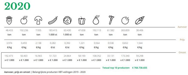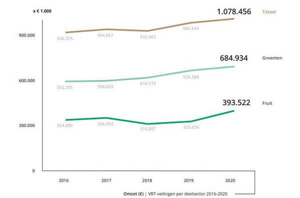 De omzet van groenten en fruit bedroeg 1.078 miljoen euro (+9%) en doorbrak daarmee de magische grens van één miljard euro. Het aandeel groenten in de omzet bedroeg 685 miljoen euro (63,5%) en het aandeel fruit was 394 miljoen euro (36,5%). Koploper onder de groenten was witloof, dat in 2020 een sterke prestatie leverde met een omzetstijging van 22%. Voor courgettes steeg de omzet met 15%. Prei en losse tomaten hadden het daarentegen zwaarder te verduren: