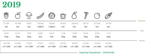 Qua productvolume was 2020 eerder een normaal jaar. Er was een normale aanvoer van groenten, met een stijging in de aanvoer van tomaten (+15% of +38 miljoen kg). Bij de aanvoer van fruit viel de sterke daling van het volume appelen op (-30% of -45 miljoen kg), doordat de appelproductie en -oogst zwaar getroffen werden door late