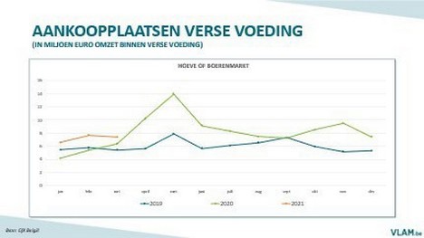 Die positieve trend in de omzet zet zich verder in 2021 in België. Voor de eerste 3 maanden van 2021 zien we een groei van 36% t.o.v. 2020. De evolutie van de omzet op de verkoop op de hoeve en de boerenmarkten:
