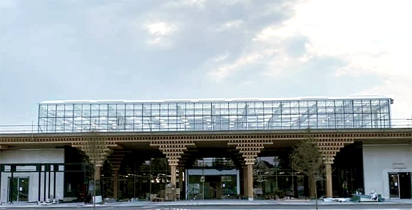 Kolommen van gestapeld hout zijn de ondersteuning voor de glazen dakkas en vormen een gewelfde structuur die tot in de winkel komt. Binnen kijken de klanten uit op een glazen atrium: de kas op het dak. "Er is een natuurlijke marktsfeer met veel daglicht gecreëerd," onthult Peter.