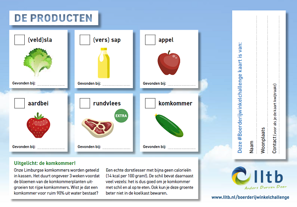 Om de boerderijverkoop onder de aandacht bij Limburgse consumenten te brengen houdt LLTB een #Boerderijwinkelchallenge. Hierbij gaan deelnemers op zoek gaan naar afgebeelde producten op de ‘bingokaart’ bij een agrarisch verkooppunt. Het vinden van het product in de supermarkt telt niet. Ieder seizoen is er een nieuwe bingoronde.