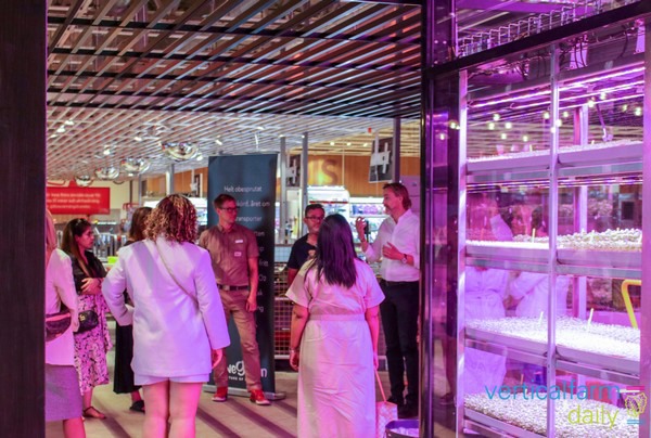 Alle processen vinden plaats in de faciliteit zelf, van het zaaien tot aan het oogsten en verpakken van de producten. Bezoekers van de supermarkt kunnen precies zien wat er in de vertical farm gebeurt.