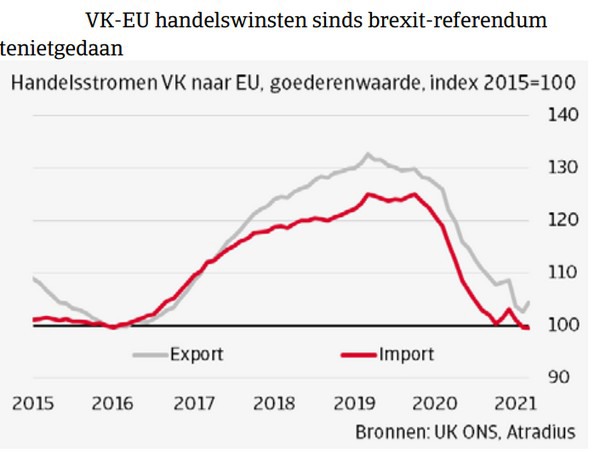 Kredietverzekeraar Atradius heeft een onderzoek gepubliceerd over de invloed van de Brexit op de internationale handel van het Verenigd Koninkrijk. Eén van de conclusies is dat de handel tussen het VK en de Europese Unie is gedaald tot ongekende niveaus sinds begin 2016.