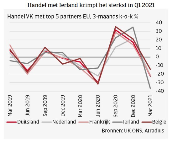 Aangezien er slechts gegevens over een kwartaal zijn sinds de ondertekening van de vrijhandelsovereenkomst tussen de EU en het VK, is er een opmerkelijke ontwikkeling in de handel van het VK. Q1 2021 is het eerste kwartaal sinds in de recente geschiedenis waarin
