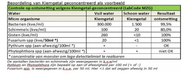 Focus bij microbiologie ligt op het monitoren van water op een aantal plaatsen in het systeem. Ten minste zou men uitgangswater voor en na de ontsmetten en zeker het druppelwater regelmatig mogen controleren op kiemgetallen. Dat kan een beperkte controle zijn op alleen bacteriën en schimmels maar steeds meer bedrijven hechten er waarde aan om zogenaamd ‘Kiemgetal uitgebreid’ te laten bepalen waarmee ook de laagst mogelijke besmetting van Fusarium, Pythium en Phythophthora in beeld komt. En dat kan kritisch zijn om het systeem goed te beoordelen, want ook al controleert en ontsmet de teler het water, in opslag of in het systeem kan helaas weer vermeerdering van microbiologie plaatsvinden omdat er een paar sporen zijn achtergebleven.
