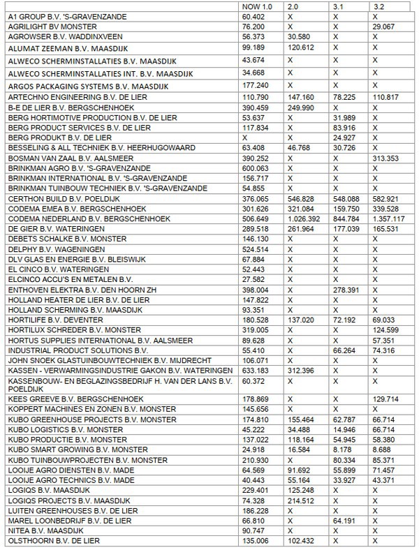 Net als in eerdere NOW-rondes heeft de redactie haar best gedaan een tuinbouwoverzicht te geven zonder te pretenderen volledig te zijn. Het overzicht (onderaan) is tot stand gekomen op basis van openbaar beschikbare informatie en geeft een inkijkje in de financiële stand van zaken in de sector.
