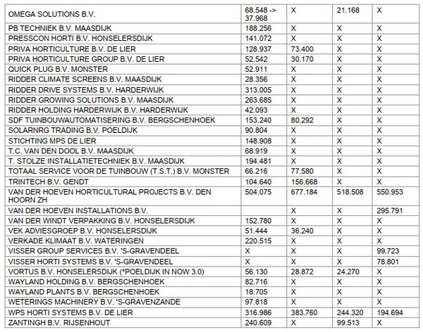 Hieronder een overzicht, opgesteld door de redactie op basis van gegevens uit de vier rondes waarover het UVW al publiceerde. Zoals al gezegd: wij pretenderen niet volledig te zijn, maar geven met de lijst een inkijkje in de financiële situatie in de sector. Daarbij dient men te bedenken dat het uiteindelijk de telers zijn die producten van tuinbouwtoeleveranciers afnemen en dat als zij het zwaar hebben, toeleveranciers dat ook (gaan) merken.