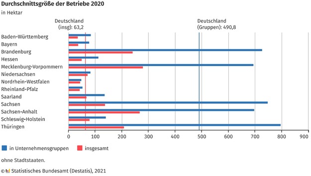 Volgens de gegevens was in heel Duitsland meer dan één derde (36%) van de landbouwbedrijven in de rechtsvorm juridische persoon of personenvennootschap onderdeel van een (agrarische) bedrijfsconcern. Van meer dan een kwart van die bedrijvengroepen is óf niet bekend of de hoofdvestiging in Duitsland gevestigd is óf is zeker dat de hoofdvestiging in het buitenland gevestigd is.