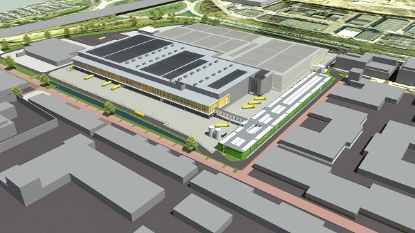 Illustratie van het nieuwe CDC Vers in Nieuwegein, met een oppervlakte van zo’n 40.000 m2. Op de achtergrond het huidige CDC houdbaar en aan de rechterzijde de reeds bestaande parkeergarage.