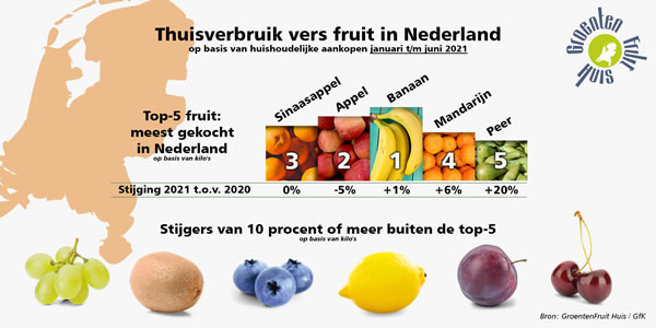 Banaan (+1%) veroverde de eerste plaats in de Top-10 aankopen fruit. Op korte afstand gevolgd door appel (-5%) die in andere jaren meestal op de eerste plaats staat. Oorzaak wordt gezocht in de kleine Nederlandse appeloogst in 2020. Dit gaf hogere consumentenprijzen en minder prijsacties dan vorig jaar. De perenconsumptie stond de afgelopen jaren wat onder druk. Daar kwam de eerste helft van dit jaar verandering in. Nederlanders kochten 20 procent meer. Door het koude voorjaar was de internationale aanvoer van zomerfruit vertraagd. Dit was ook gunstig voor de perenverkoop. Naast peren waren blauwe bessen (+14%), kiwi's (+14%), druiven (+11%) en citroenen (+10%) populair in de eerste helft van het jaar.