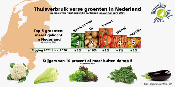 consumenten zet in 2021 door. Van januari tot eind juni kochten huishoudens 4 procent meer verse groenten en 3 procent meer fruit dan een jaar geleden. Gemiddeld groeide de consumentenaankopen van het hele assortiment groenten en fruit met vier procent. Dit blijkt uit informatie van GroentenFruit Huis op basis van data van onderzoeksbureau GfK. De cijfers die meer kunnen zeggen over groenten- en fruitconsumptie buitenshuis, zijn nog niet bekend.