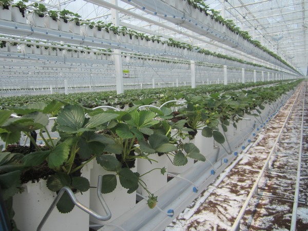 Eenmaal binnen staan we in een verpakkingshal waar we de geur van aardbeien in ons opnemen. Een relatief klein kantoor met niet veel mensen geeft de Nederlandse manier van werken aan. Samen met Ton loop ik door de corridor van 8 meter breed, die de beide kassen met elkaar verbindt. De lengte kun je met het blote oog niet inschatten.