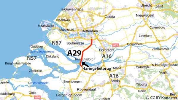 Vanaf maandag 23 augustus is de maximumsnelheid op de Haringvlietbrug (A29) nog maar 50 kilometer per uur. In beide richtingen zijn er dan maar twee versmalde rijstroken beschikbaar (aanvankelijk zou in beide richtingen maar één rijstrook openblijven). Rijkswaterstaat treft deze maatregelen omdat de klep van de brug in slechte staat is.