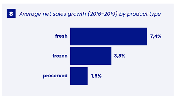 Met een gemiddelde van 6,1% per jaar in de periode demonstreren de groente en fruitbedrijven een gezonde groei. Consumenten prefereren verse groenten en fruit (7,4% groei) in toenemende mate boven bevroren (3,8% groei) en geconserveerde (1,5% groei) producten – die als minder gezond worden beschouwd. Binnen de categorie vers fruit groeien de spelers die focussen op exclusievere fruitsoorten zoals exoten en zacht fruit het sterkst.