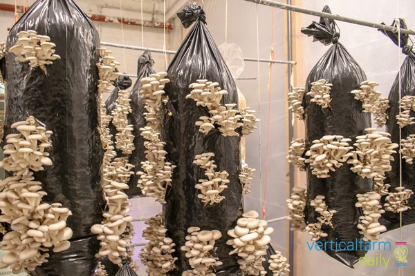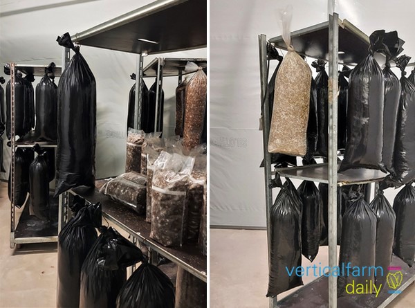 De zakken worden verticaal opgehangen zodat alle teeltoppervlakken gebruikt kunnen worden voor de teelt. Elke kamer is gevuld met vele zakken, die allemaal uit oesterzwammen bestaan. Julie legt uit dat het de handigste soort is om op koffiedik te kweken, vooral in deze voormalige inventarisruimtes. "Omdat de zakken hangen, zijn we niet afhankelijk van grond om te telen en kunnen we andere of verlaten ruimtes in gebruik nemen."