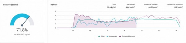 De resultaten worden weergegeven in grafieken die de mate van efficiëntie van de teelt laten zien en tonen waar de teeltstrategie precies kan worden verbeterd. Unrealized Potential geeft feedback over volgende waardevolle parameters: plantdichtheid, vruchten per tros en kunstlichtstrategie. Door de aanbevolen parameters te volgen, gebaseerd op de werkelijke temperatuur en gewascyclusinstellingen, kunnen het maximale oogstpotentieel en de meest efficiënte lichturenstrategie worden bereikt.