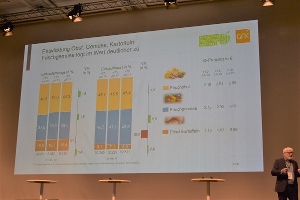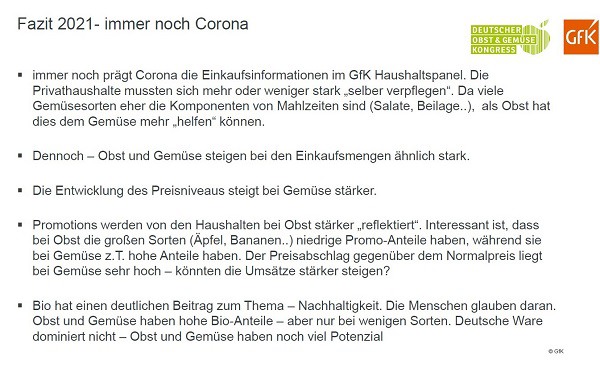 Helmut Hübsch van GfK presenteerde op het Duitse groenten- en fruitcongres (DOGK) actuele cijfers en prognoses voor het jaar 2021. Terwijl de thuisconsumptie in 2020 vanwege de lockdown sterk gestegen is, nam de consumptie buitenshuis juist af. Zo lag het aandeel aan de totale omzet in de buitenshuisconsumptie in 2019 nog op 40%, terwijl dat percentage afgelopen jaar slechts 33% bedroeg.