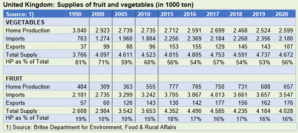 Met een import van ca. 3,5 miljoen ton fruit en 2,2 miljoen groenten is het Verenigd Koninkrijk een grote importeur. Bij groenten na de Verenigde Staten en Duitsland de nummer 3 en bij fruit na de VS, Duitsland, Rusland, China en Nederland de nummer 6. Tomaten is de belangrijkste groente die wordt ingevoerd. Jaarlijks gaat het om 400.000 ton; dan volgen uien 300-400.000 ton, paprika’s 220.000 ton, sla 200.000 ton, komkommers 200.000 ton, bloemkool/broccoli 130.000 ton en champignons 120.000 ton. Bananen is veruit het belangrijkste fruitproduct dat in het Verenigd Koninkrijk wordt ingevoerd. Jaarlijks gaat het om meer dan een miljoen ton. Dan volgen appelen met 350.000 ton, meloenen  320.000 ton, mandarijnen 310.000 ton, druiven 280.00 ton en sinaasappelen 270.000 ton.