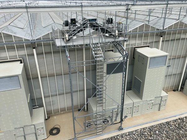 De kasdekreinigers zijn ook volledig op maat gebouwd zodat ze tussen de stalen constructie van het buitenscherm passen. Tevens is er een spuitboom op geplaatst waarmee een coating op het glas kan worden gespoten.