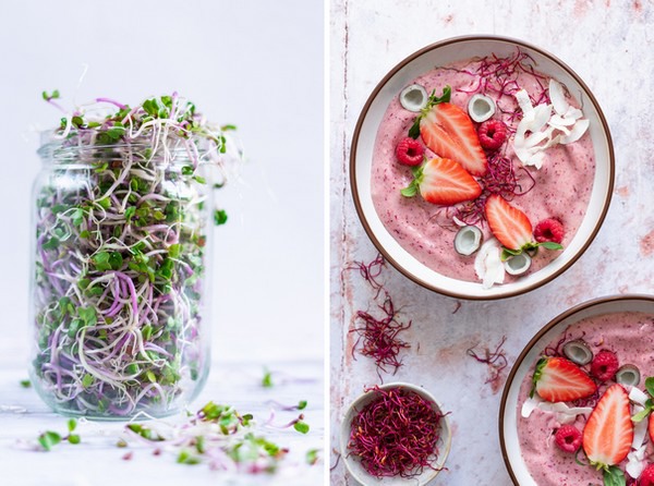 Links: China Rose kiemen, rechts: rode bieten smoothie bowl