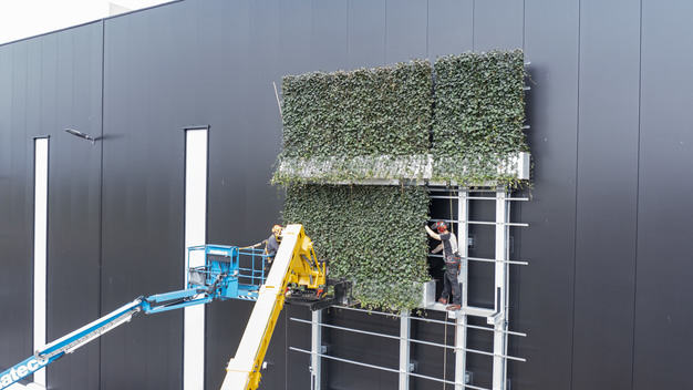Het Wallplanter-gevelsysteem bestaat uit een stalen basisconstructie met daaraan bevestigde bakken (50 x 50 x 390 cm) van hoogwaardig aluminium. Die zijn beplant met Mobilane Kant & Klaar Hagen (Hedera helix ‘Woerner’) met een hoogte van 200 cm. Bij volledige verzadiging weegt elke bak 1.450 kilo. Een teleporter tilt de bak met volgroeide klimophagen omhoog waarna ze bevestigd worden aan de basisconstructie.