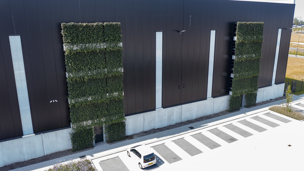 De groene gevel is aangebracht op het magazijngedeelte en is ingedeeld in drie stroken van 6 meter breed en 12,5 meter hoog. Met het permanent groene aanzicht van het gebouw onderstreept LC Packaging het belang van duurzaamheid. Onlangs behaalde de nieuwbouw van de verpakkingsspecialist het BREEAM Outstanding certificaat voor een duurzaam gebouwde omgeving.