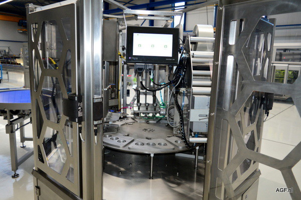 De Rotofill, een carrousel machine. Ontstapelen, vullen, sealen en dekselen in een roterende beweging