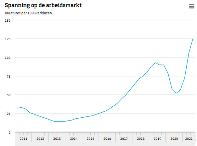 Een verdere groei van het aantal vacatures, samen met een dalende werkloosheid, leidden in het derde kwartaal van 2021 tot een nog grotere spanning op de arbeidsmarkt. Tegenover elke 100 werklozen stonden 126 vacatures. Het aantal banen nam toe met 162.000 en kwam voor het eerst boven de 11 miljoen. Dat blijkt uit nieuwe cijfers van het CBS over de arbeidsmarkt.
