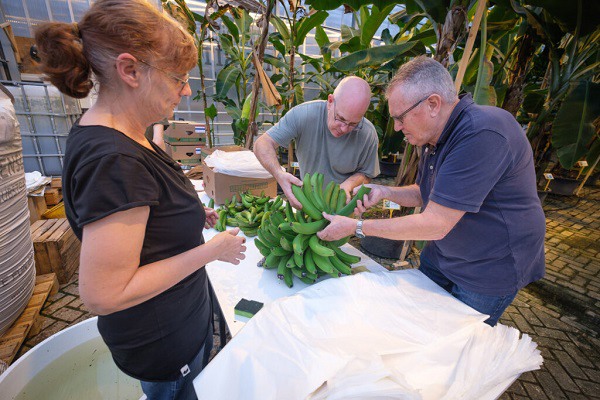 Tholen - Gisteren werden 1.600 Neder Bananen geoogst, geteeld in de kas op substraat. Op deze wijze probeert Wageningen University & Research (WUR) de wereldwijde bananenteelt te redden van de gevreesde en oprukkende Panamaziekte. De Nederlandse bananen gaan niet de markt op, ze eindigen als bananensoesjes en in bananenbier, maar niet voordat ze zijn gerijpt door de Groot fresh group.