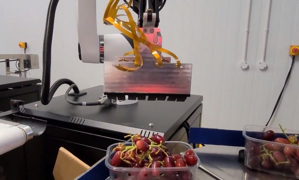 "De robot raamt het gewicht en kan de druiventros afknippen tot het juiste gewicht. De verschillende robots in deze lijn communiceren met elkaar om te garanderen dat het gewicht en de presentatie correct zijn. Er kan een persoon aanwezig zijn bij de lijn om de uiteindelijke presentatie te checken."