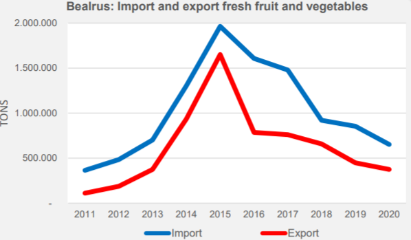De Wit-Russische import van verse groenten en fruit bereikte in 2015 een piek met 2 miljoen ton. Na het instellen van de importboycot door Rusland medio 2014 nam de import in Wit-Rusland een grote vlucht. Daarna nam die geleidelijk af naar 650.000 ton in het afgelopen jaar In bepaalde jaren werd er volgens de Wit-Russische douane verse groenten en fruit ingevoerd uit allerlei vaak ook exotische landen tot peren uit Jemen aan toe! Aan die “handel” is nu goeddeels een einde gekomen.