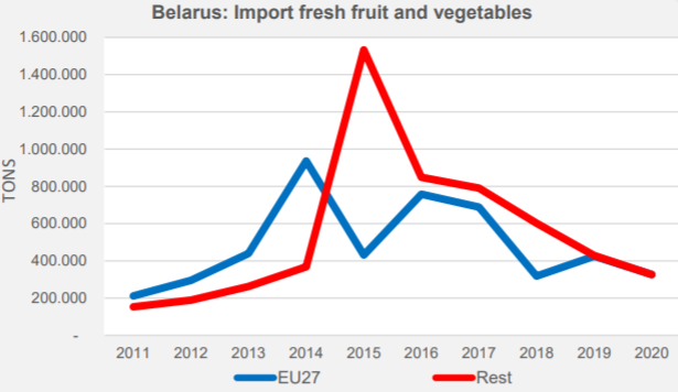 Wit-Rusland gaat vanaf 1 januari 2022 de import van o.a. verse groenten en fruit uit onder meer de EU-landen verbieden, zo berichtten wij gisteren. Volgens cijfers van Eurostat werd er vorig jaar meer dan 400.000 ton verse groenten en fruit uit/via EU landen naar Wit Rusland uitgevoerd. Uitgaande van de cijfers over de eerste 9 maanden zal dat dit jaar nog wat meer zijn. Overigens was dat een aantal jaren terug meer dan een miljoen ton. Dat was vlak na het instellen van de Russische importboycot.