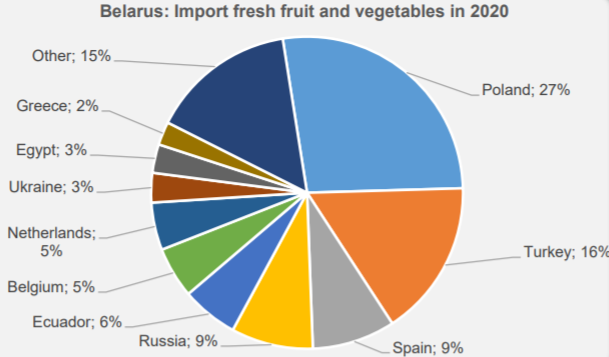 Belangrijkste niet-EU-leverancier is Turkije. In 2020 ging het om 106.000 ton. Daarvoor was het meer met een piek in 2017. Toen werd ere 215.000 ton uit Turkije ingevoerd. Peren is het belangrijkste product gevolgd door tomaten en perziken/nectarines. Spanje is volgens Wit-Russische douane de nummer drie met vorig jaar een import van 56.000 ton. Opvallend is ook de import uit Rusland, vorig jaar 55.000 ton. Bananen en watermeloenen zijn de belangrijkste producten die via Rusland in Wit-Rusland terechtkwamen. Dan volgen Ecuador (38.000 ton), België (35.000), Nederland (32.000) en Oekraïne (20.000 ton).