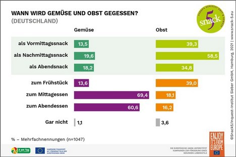 Uit de resultaten van de enquête blijkt dat groenten vaker bij de hoofdmaaltijden worden gegeten, en fruit als tussendoortje. Groenten worden vooral bij de lunch en het avondeten gegeten, maar spelen geen rol van betekenis bij het ontbijt of als tussendoortje tussen de hoofdmaaltijden. Slechts ongeveer 14% van de respondenten in Duitsland (16,8% in Oostenrijk) zet komkommers, cocktailtomaten of andere groenteklassiekers op de ontbijttafel. Amper 20% van de ondervraagden zegt de hele dag door groenten te snacken, tussen de maaltijden door. Het beeld is anders voor fruit: voor bijna 60% van de respondenten in Duitsland (68,8% in Oostenrijk) is dit een populaire namiddagsnack.