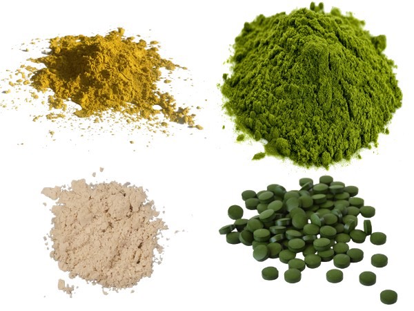 Gele, groene en witte Chlorella vulgaris en tabletten van biologische Chlorella