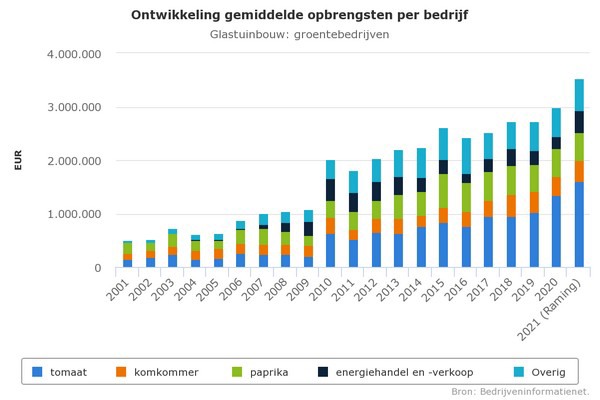 Voor het gemiddelde glasgroentebedrijf nemen in 2021 de geraamde totale opbrengsten met ruim 18% toe tot bijna 3,6 miljoen euro. Deze groei is in vergelijking met voorgaande jaren fors. De afgelopen 10 jaar kwam een dergelijke stijging van de opbrengsten niet voor. De groei is het gevolg van een stijging van de omvang van een gemiddelde bedrijf, sterk verbeterde tomatenprijzen en gemiddeld genomen hogere opbrengsten vanuit de verkoop van elektriciteit.