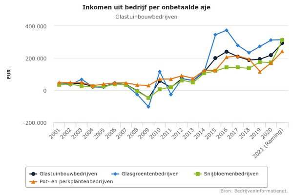 Het inkomen uit bedrijf in 2021 wordt voor een gemiddeld glastuinbouwbedrijf geraamd op ruim 290.000 euro per onbetaalde arbeidsjaareenheid. Dit is ruim 70.000 euro hoger dan in 2020 en het gemiddeld inkomen in de periode 2015-2020. Het inkomen steeg omdat de opbrengsten sterker stegen (21%) dan de kosten (18%). De stijging is te danken aan stijging in de sierteelt. Het inkomen in de glasgroenteteelt stabiliseerde in 2021.