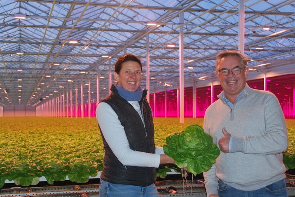Franky Hens en Kirsten Audenaert van de Vlaamse slateler Slamotra namen enkele weken geleden de derde en laatste fase LED-verlichting in gebruik in hun kas van 3,3 hectare in Kruibeke. Bij Slamotra worden 5 soorten sla op natuurlijke wijze gekweekt op goten.