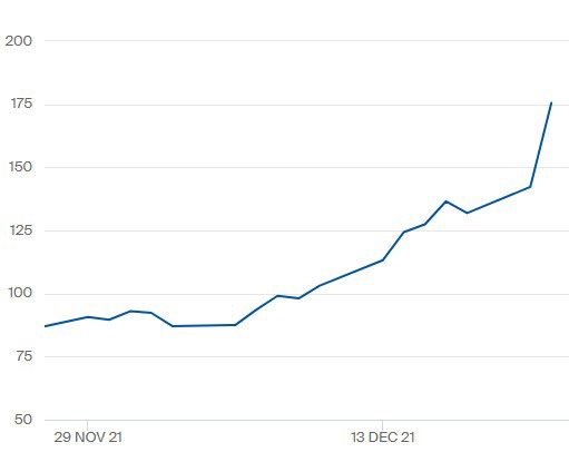 Voor alle kwartalen van 2022 ligt de gasprijs nu boven de 100ct/m3-grens. De gasprijs voor kwartaal 1 2022 is in bovenstaande grafiek te zien (cijfers t/m 21-12-2021). Klik hier voor vergroting.