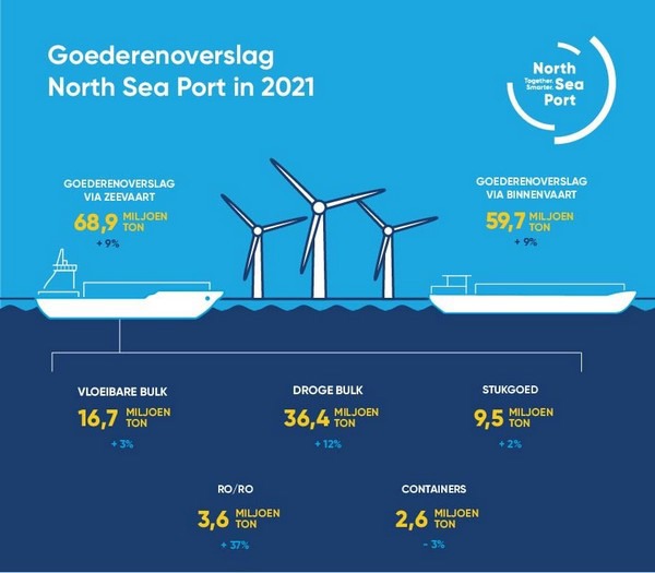 Met bijna 69 miljoen ton goederenoverslag via zeevaart in 2021 groeide North Sea Port 9% ten opzichte van het coronajaar 2020. De overslag via binnenvaart kende met afgerond 60 miljoen zelfs een volledig herstel.