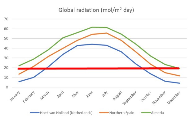Het bedrijf van de twee broers teelt enkel in het voor- en najaar. In de zomer is het immers niet interessant om tomaten op de markt te brengen, omdat het aanbod van vollegrondstomaten ruim is en de prijzen laag liggen. Ook in de winter gaat het niet, omdat het lichtniveau onder de dagelijks vereiste 20 mol/m2 ligt. In Almería kan dat wel, want daar bereikt het lichtniveau deze waarde wel in de winter. In Noord-Spanje is het stralingsniveau gedurende ongeveer 3 maanden onder de vereiste 20 mol. In Nederland bijvoorbeeld, een belangrijk tomatenland, is de periode met lage lichtniveaus nog langer.