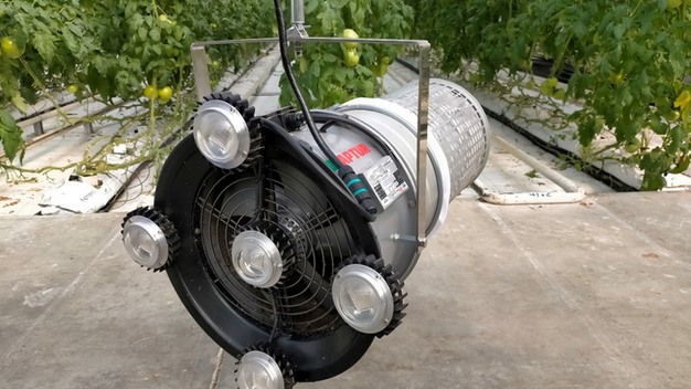 De machine heeft zeer specifieke LED-lampjes die alleen 's nachts worden ingeschakeld om te voorkomen dat ze hommels aantrekken. De Tuta Absoluta motten komen wel en worden in de verzamelaar gezogen.